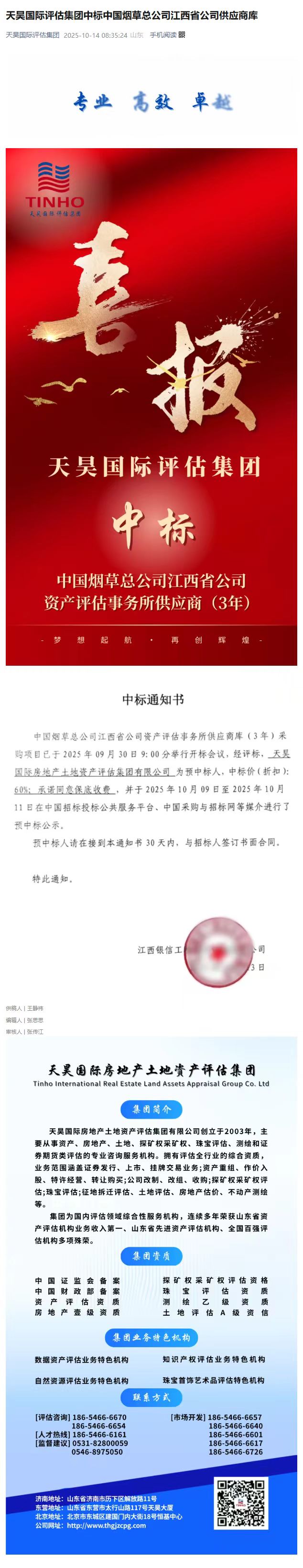 天昊国际评估集团中标中国烟草总公司江西省公司供应商库