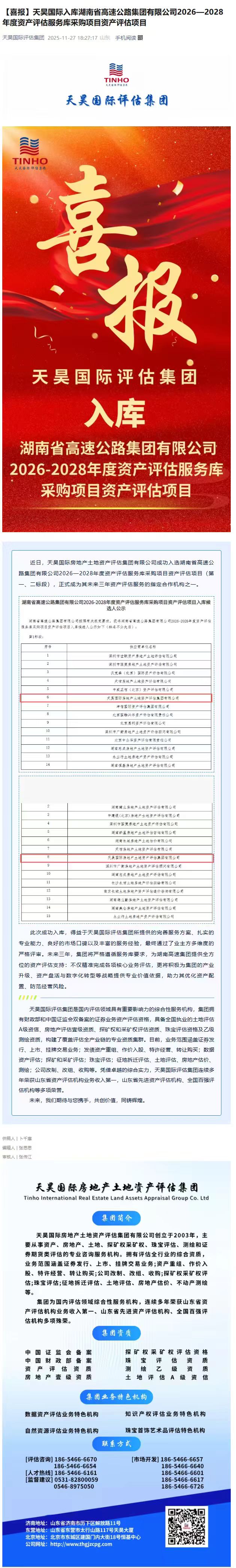 【喜报】天昊国际入库湖南省高速公路集团有限公司2026—2028年度资产评估服务库采购项目资产评估项目