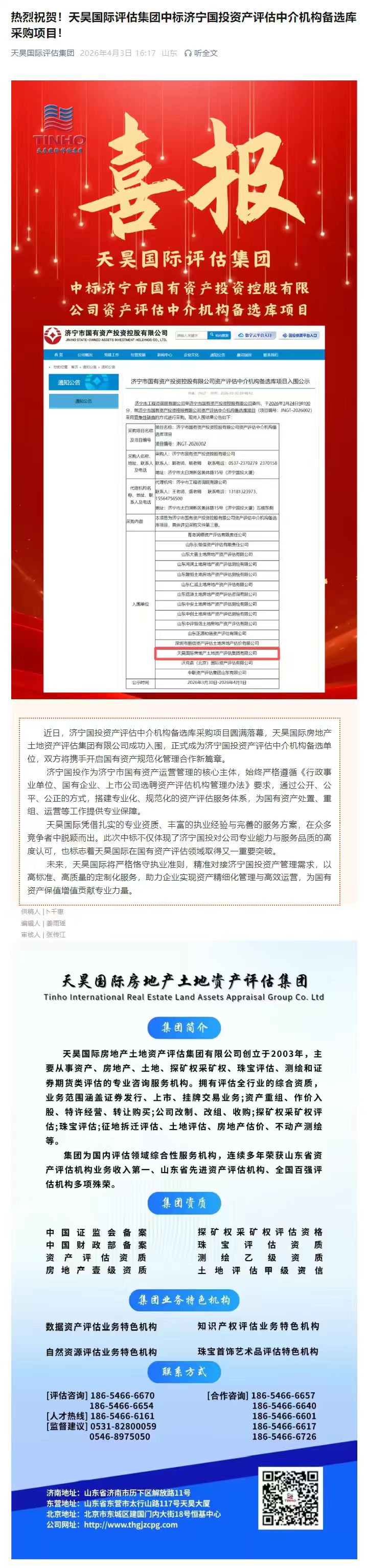 热烈祝贺!天昊国际评估集团中标济宁国投资产评估中介机构备选库采购项目!